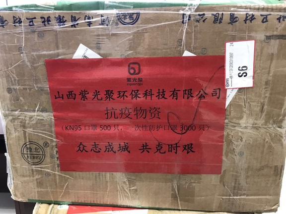 3月7日,山西紫光聚環(huán)保科技有限公司捐贈(zèng)的口罩交接到位。