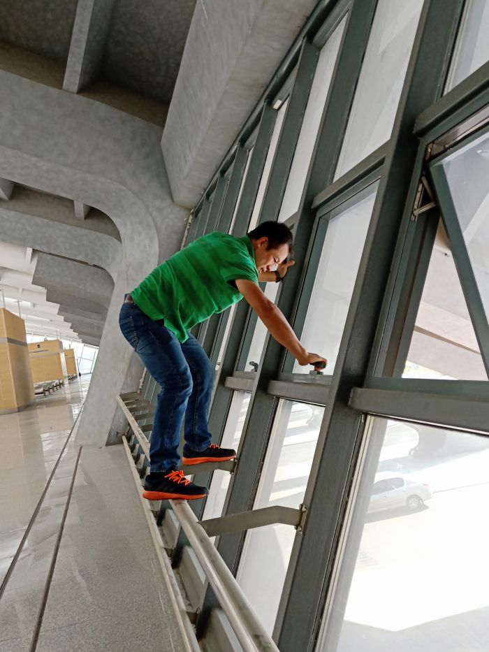 主站樓部分是攻堅(jiān)之戰(zhàn),30位員工在透明的頂棚下感受悶熱灼曬、揮汗如雨,每一塊地磚都是經(jīng)過(guò)了水沖、塵推、除塵、清洗、抹凈、擦干等六道工序,方可達(dá)標(biāo)。上下兩層共26912平方米,經(jīng)過(guò)兩天半的時(shí)間終于完工,看著光亮如新、纖塵不染的候車廳,所有員工的臉上都綻放了發(fā)自內(nèi)心的微笑。